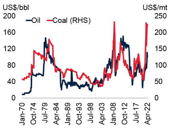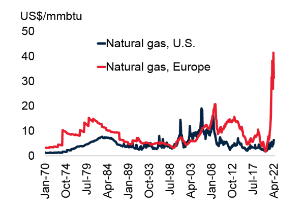 Graf nižšie zobrazuje dlhodobý vývoj cien ropy, plynu a uhlia. Index cien energií Svetovej banky sa medzi januárom a aprílom 2022 zvýšil o 26,3 %. Išlo hlavne o prudký nárast cien uhlia, ropy a zemného plynu. V nominálnom vyjadrení sa ceny ropy od apríla 2020 do apríla 2022 zvýšili o 350 %. Ide tak o najväčší rast od 70. rokov minulého storočia. Ceny uhlia a plynu medzitým dosiahli historické maximá v nominálnom vyjadrení. V reálnom vyjadrení však iba európske ceny zemného plynu dosiahli historické maximá.