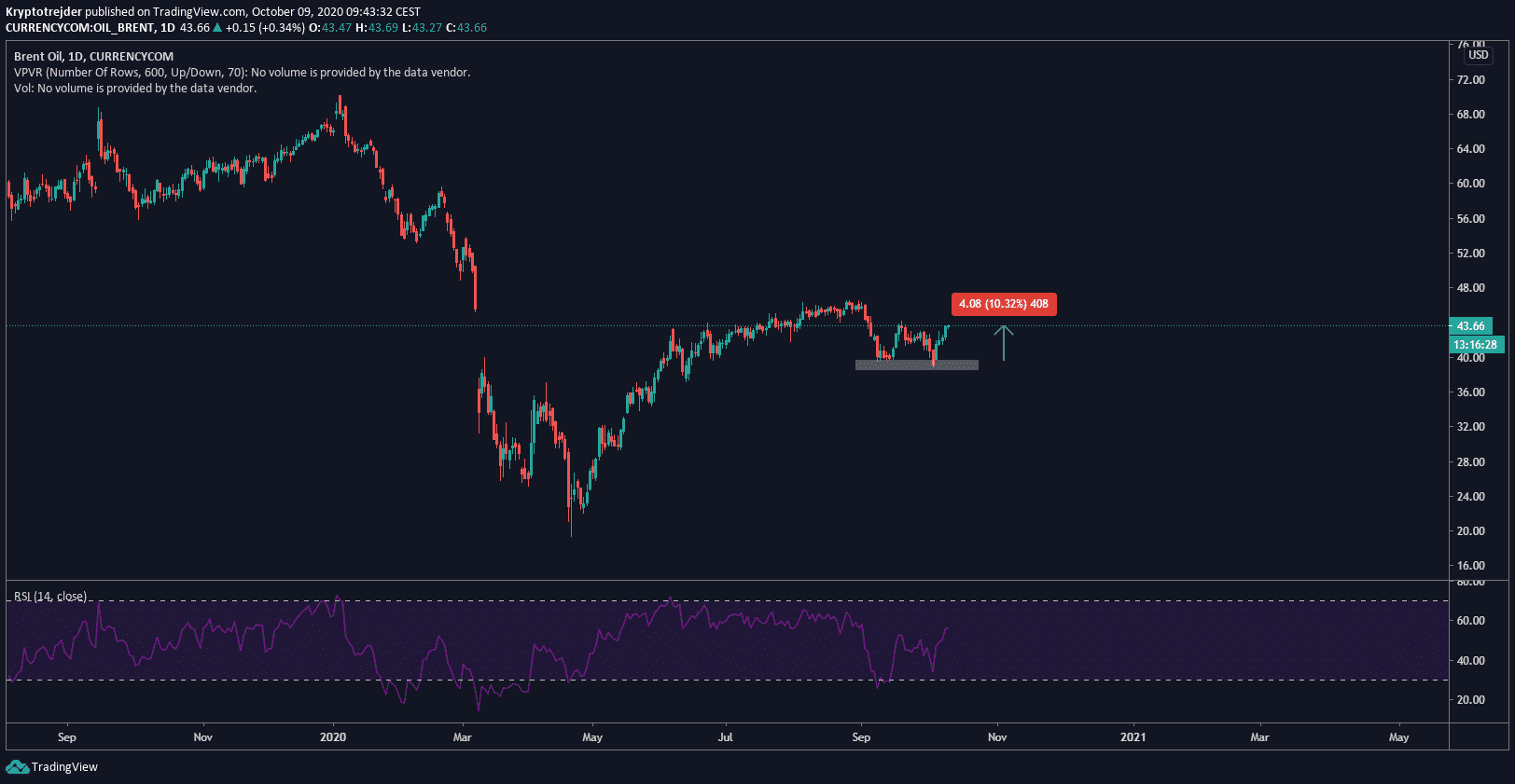Brent narástol o čosi menej v porovnaní s WTI. Išlo o nárast počas tohto obchodného týždňa o 10,3%. Na začiatku týždňa sa ceny pohybovali na úrovni 39,50 dolárov, pričom momentálna cena je na hodnote 43,65 dolárov za barel.