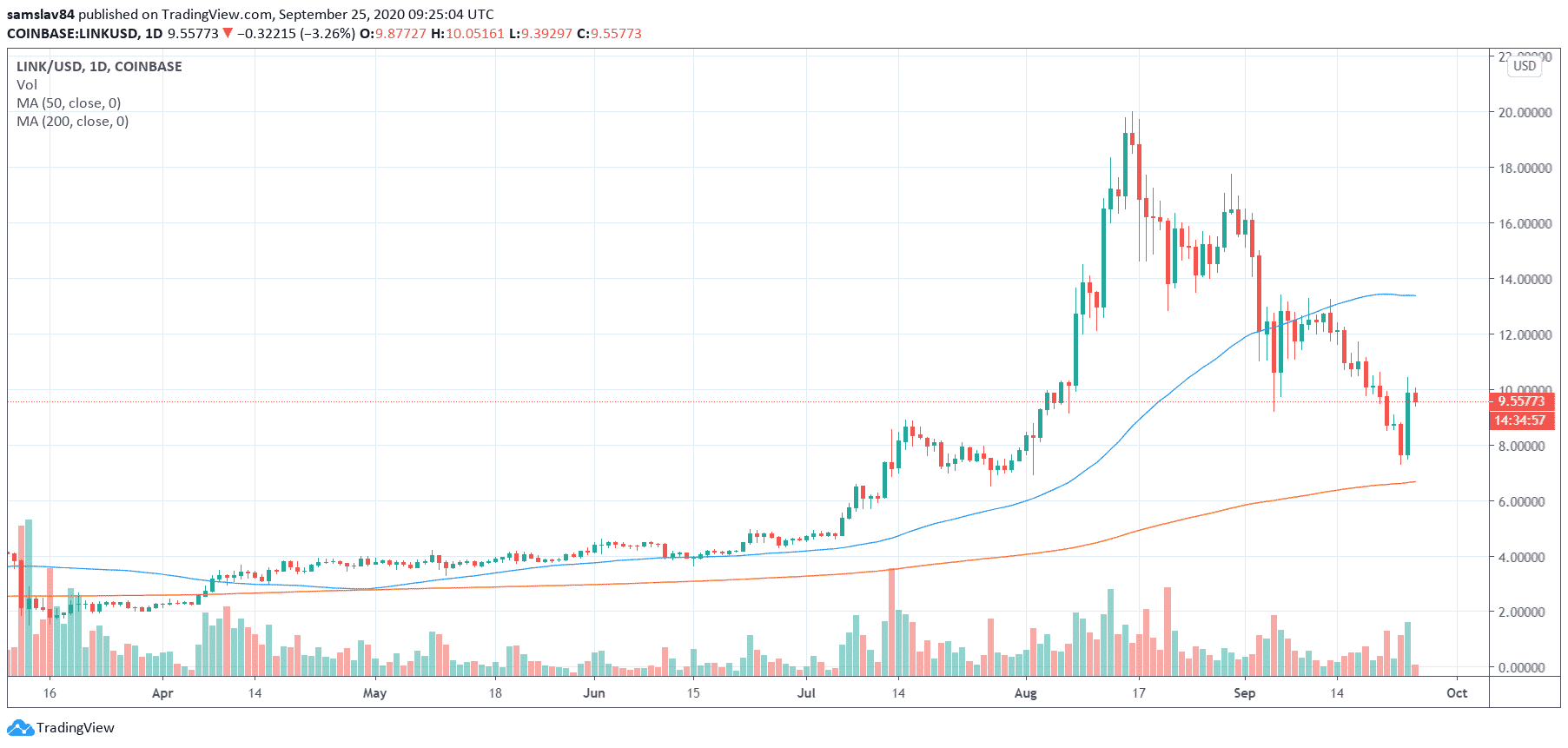 LINK ste mohli v marci kúpiť za 1,5 $. Rallye na dvadsať dolárov teda bolo skutočne neuveriteľné. Podobne ako každý UPtrend, aj tento nakoniec skončil, keď sa veľryby rozhodli vyberať zisky.
