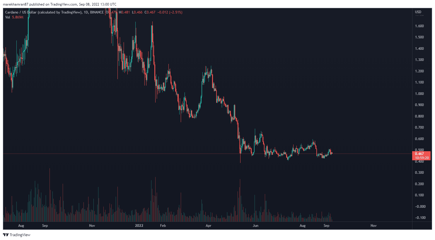Pád postihol aj token siete Cardano ADA. V čase písania tohto článku sa cena tokenu pohybovala na úrovni 0,467 dolárov. Táto hranica je veľmi blízko k minimu na úrovni 0,4306 dolárov.