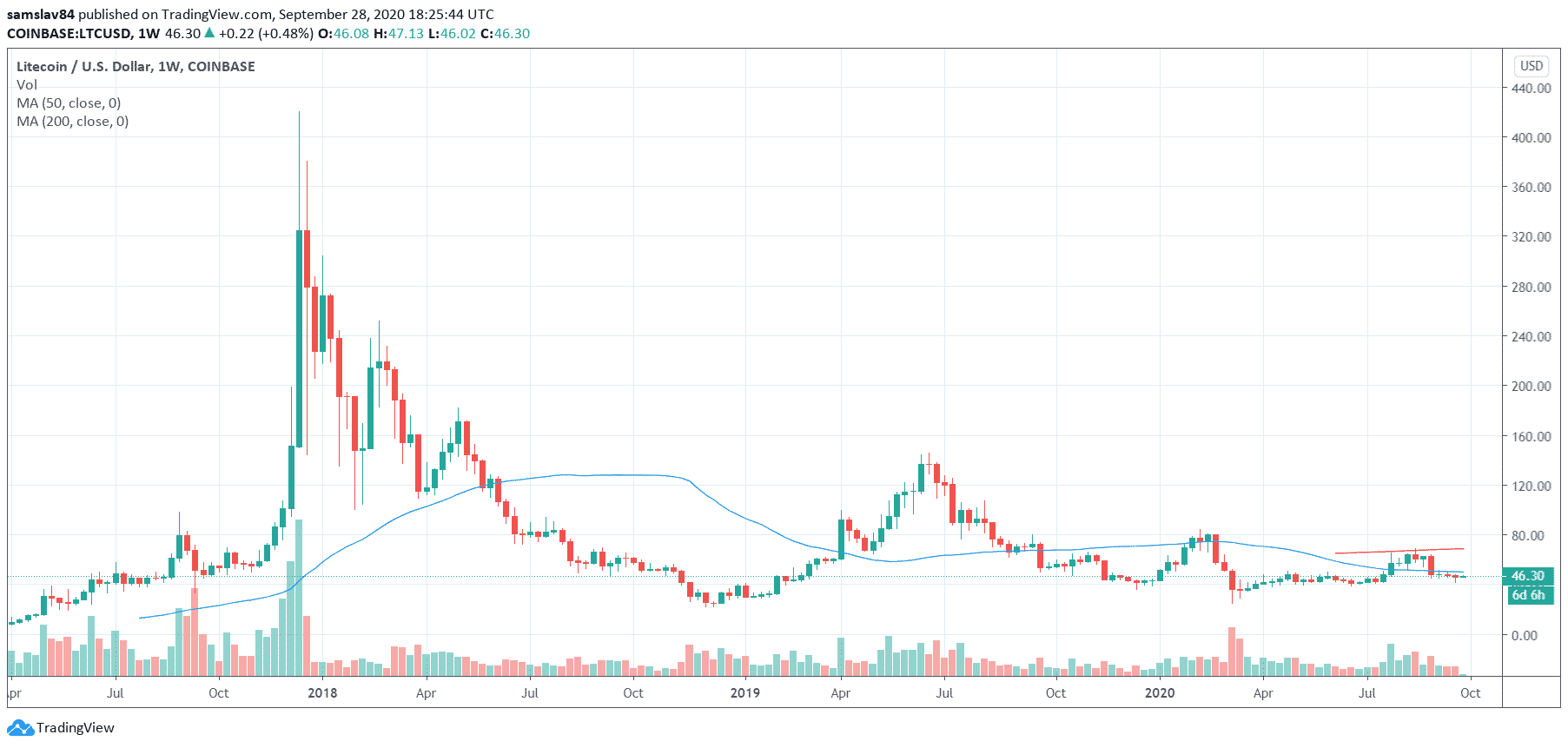 Litecoin sa v súčasnosti obchoduje za 45 $. Bagateľ oproti 420 $, z decembra 2017. Je však vhodné dodať, že Litecoin sa už v tomto roku obchodoval aj za 83 $.