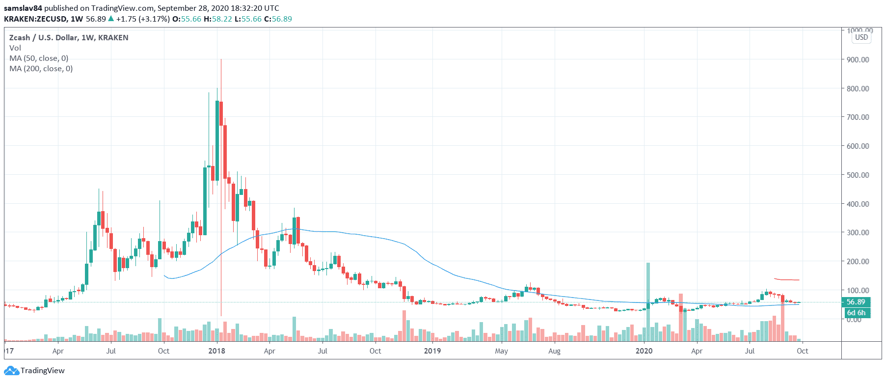 Zcash sa v polovici 2017 obchodoval za 330 $. Dnes je do 56 $. Na historickom maxime v januári 2018 ste ho mohli kúpiť/predať za 900 $.