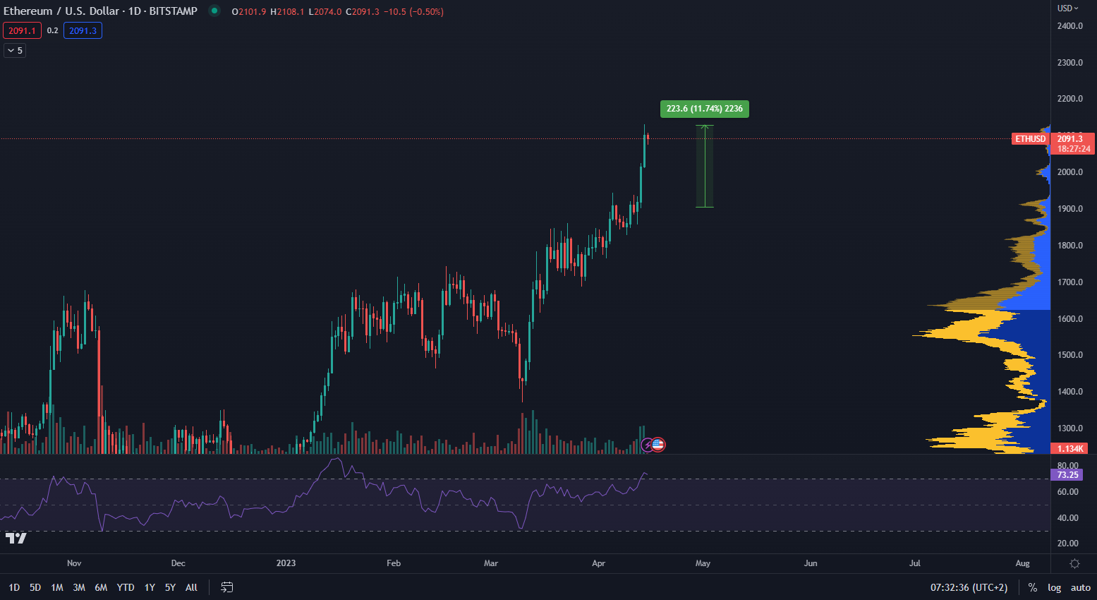 Väčšina účastníkov trhu očakávala pokles ceny po spustení aktualizácie. Opak je ale pravdou a ethereum reagovalo na udalosť pozitívne. Podľa údajov TradingView, hodnota najväčšieho altcoinu na svete narástla až o takmer 12 % len v priebehu dvoch dní. RSI ale signalizuje prehriaty trend čo znamená, že čoskoro bude musieť volatilita vychladnúť.