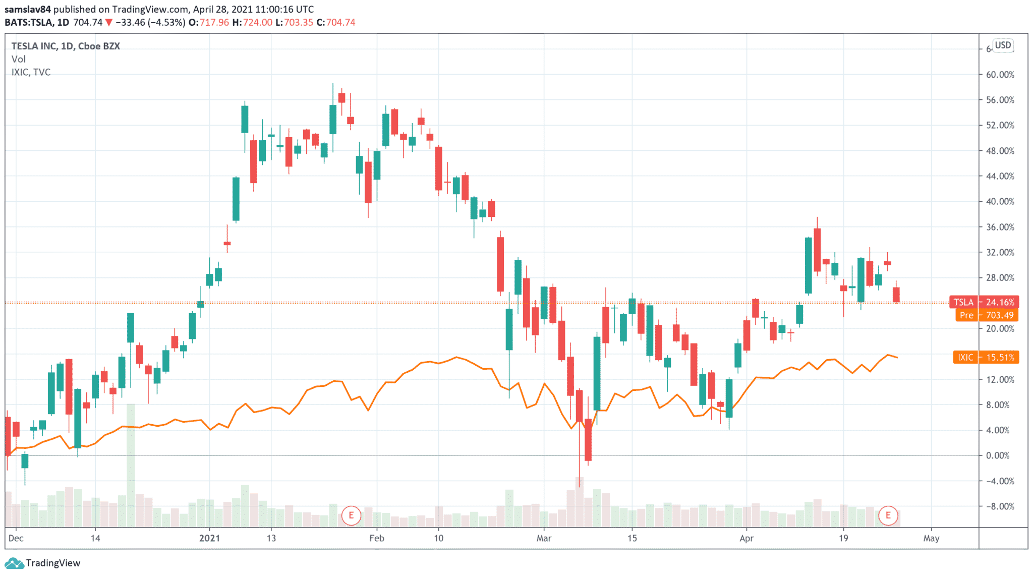 Tesla vs. IXIC – 2021Tesla za prvý kvartál 2021 hlási rekordný obrat a predala neskutočných 184 800 elektromobilov, čo je rekord a spoločnosť chce do konca roka vyrobiť a predať milión áut. To znamená, že musí výrazne zvýšiť produkciu a investovať do svojich tovární. Nebyť Bitcoinu Tesla by napriek skvelým číslam skončila v strate.
