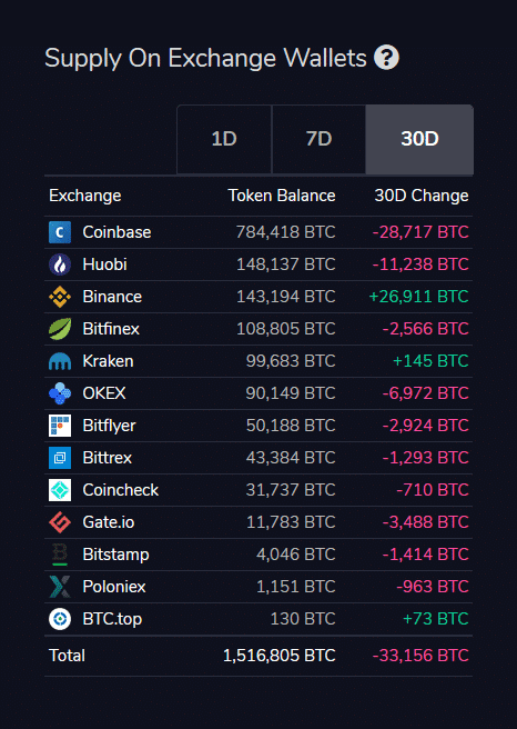 Ako môžete vidieť na obrázku vyššie, za posledných 24 hodín na burzách pribudlo cez 5000 BTC, ktoré tam boli primárne posielané za účelom predaja. Na druhej strane, ako môžete vidieť na obrázku nižšie, za posledných 30 dní však z búrz odišlo cez 33000 BTC, čomu zodpovedal rast. Ľudia totiž nakupovali BTC a iné kryptomeny a následne si ich z búrz posielali na svoje peňaženky.