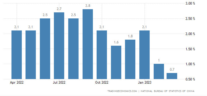 Podľa údajov TradingEconomics je inflácia v Číne momentálne na úrovni 0,7 %. Pre porovnanie, eurozóna dosahuje infláciu 6,9 % a USA 5 %. Ako vidíme na grafe nižšie, najvyššiu úroveň zaznamenala Čína v priebehu roka 2022 len na hodnote 2,8 %, čo sa ani zďaleka nedá porovnávať so západnými krajinami.