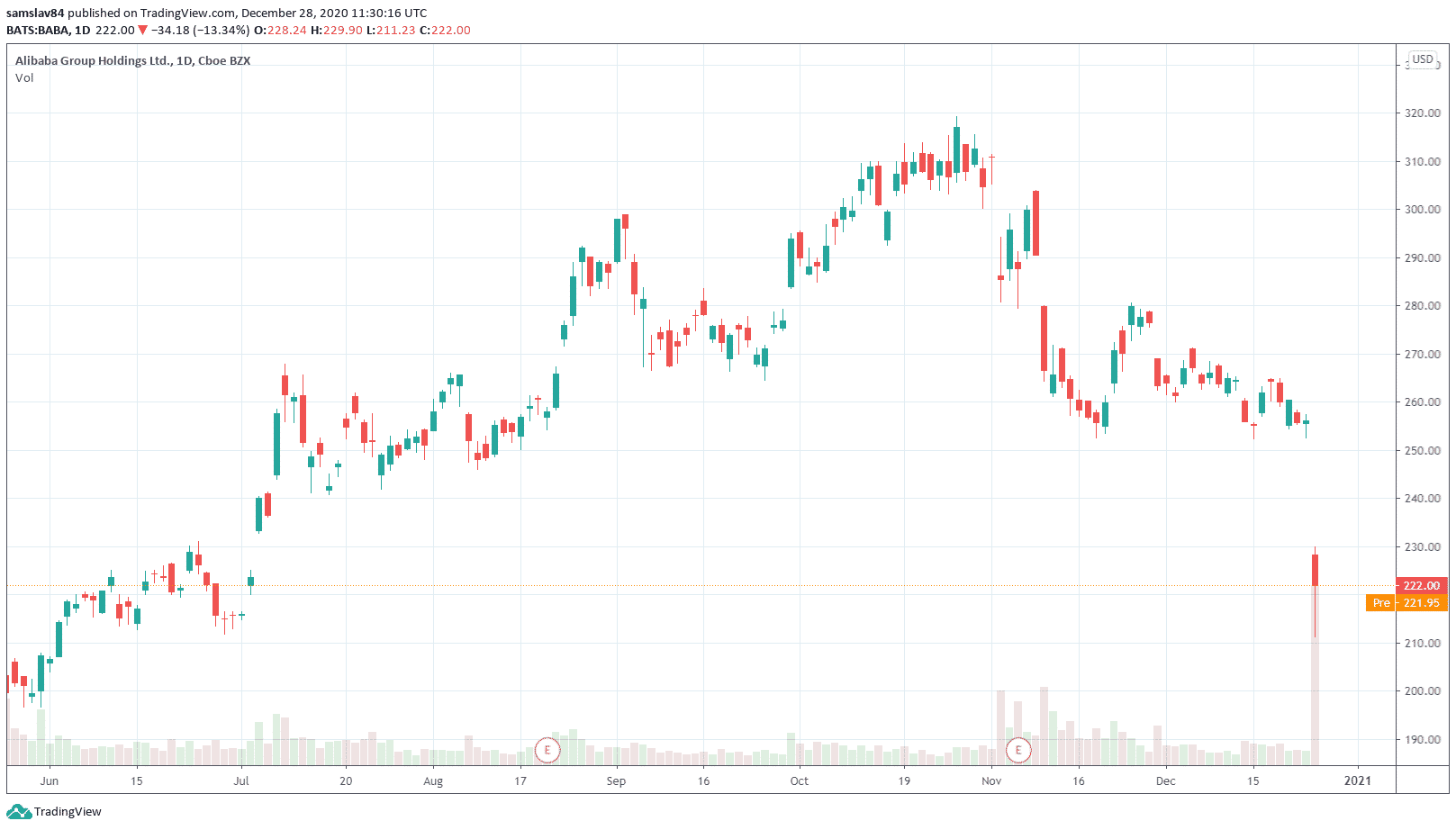 Ako môžete vidieť na grafe (hore), najväčší prepad sa udial cez víkend. V piatok sa BABA zavrela na 255 $, dnes sa začala obchodovať za 228 $. Tento víkendový pohyb nechal na grafoch obrovský gap, ktorý sa tak skoro nevyplní.