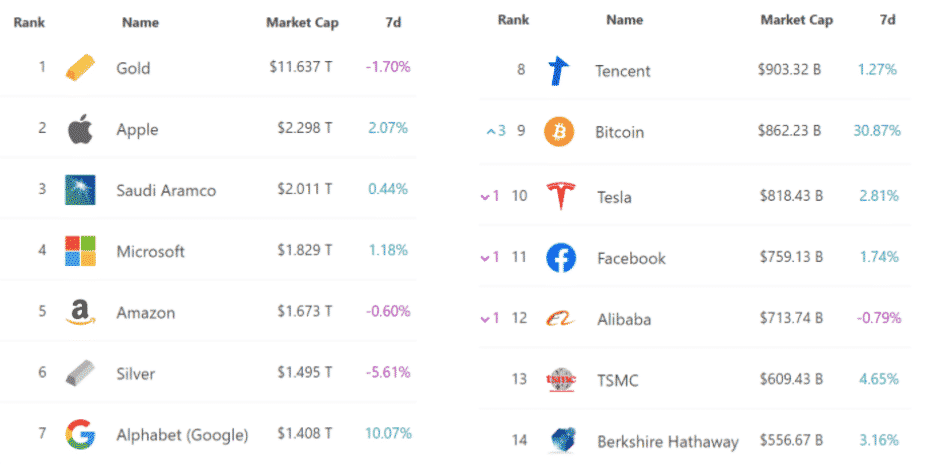 Tento týždeň tento krok spôsobil, že trhová kapitalizácia BTC prekonala Teslu a dosiahla deviatu pozíciu medzi všetkými obchodovateľnými aktívami.