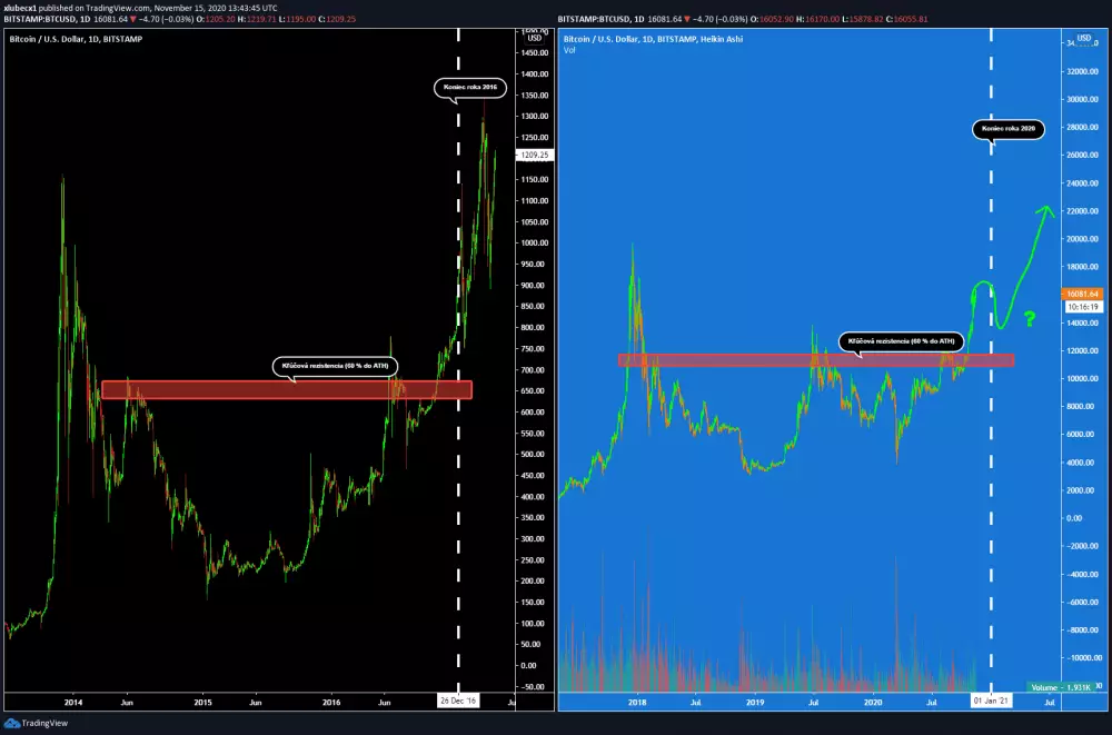 Keď sa vrátime späť na koniec roka 2016, tak zistime, že sme aktuálne v rovnakej situácii. Polroka od halvigu, BTC rastie a altcoiny klesajú. Navyše v roku 2016 tiež Bitcoin smeroval k ATH a tesne nakoniec neprerazil túto silnú úroveň.
