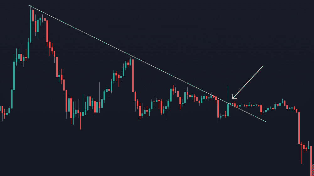 Na grafe nižšie môžeme vidieť fake breakout. Jednoducho povedané, ide o prielom supportu alebo rezistencie iba krátkodobo a väčšinou telo sviečky ostane pod úrovňou supportu alebo rezistencie. Presne taký scenár nastal na grafe dole. Knôt sviečky v takýchto prípadoch tvorí väčšinu cenového pohybu v rámci danej časovej periódy. Čím je knôt vyšší, tým je pravdepodobnosť zlyhania breakoutu taktiež vyššia. Z toho vyplýva, že je menej riskantné, ak počkáte na ukončenie danej sviečky.