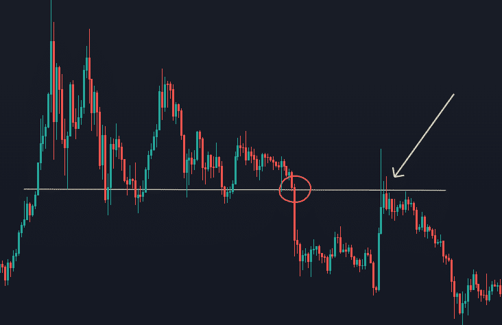 Dokonca aj po prelomení veľkého objemu sa cena často (ale nie vždy) vráti k bodu zlomu, kým sa opäť posunie v smere prelomu. Je to preto, že krátkodobí obchodníci často kúpia počiatočný zlom, ale potom sa pokúsia predať pomerne rýchlo so ziskom. Tento predaj dočasne privedie cenu späť k bodu zlomu. Ak je prerušenie legitímne (nie zlyhanie), cena by sa mala vrátiť späť v smere prelomu. Ak nie, ide o neúspešný preraz. Túto situáciu zobrazuje graf nižšie. Vidíme, že cena vytvorila v kruhu breakout a následne sa vrátila otestovať tento prerazený support a vznikla z neho rezistencia.
