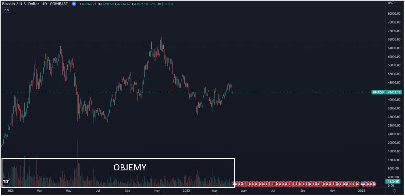 Objemy si väčšina obchodníkov vizualizuje vo vertikálnej podobe hneď pod cenovým grafom. Ide o indikátor mimo ceny, ktorý môžeme vidieť na grafe nižšie. Tieto objemy sú často používané pri identifikácii sily trendu počas reverzie. To znamená, že keď sú pri prerazení rezistencie objemy vysoké, zmena trendu bola úspešná a naopak. Viac sa o týchto objemoch môžete dočítať v článku Čo sú to obchodné objemy (volume) a ako ich obchodovať.