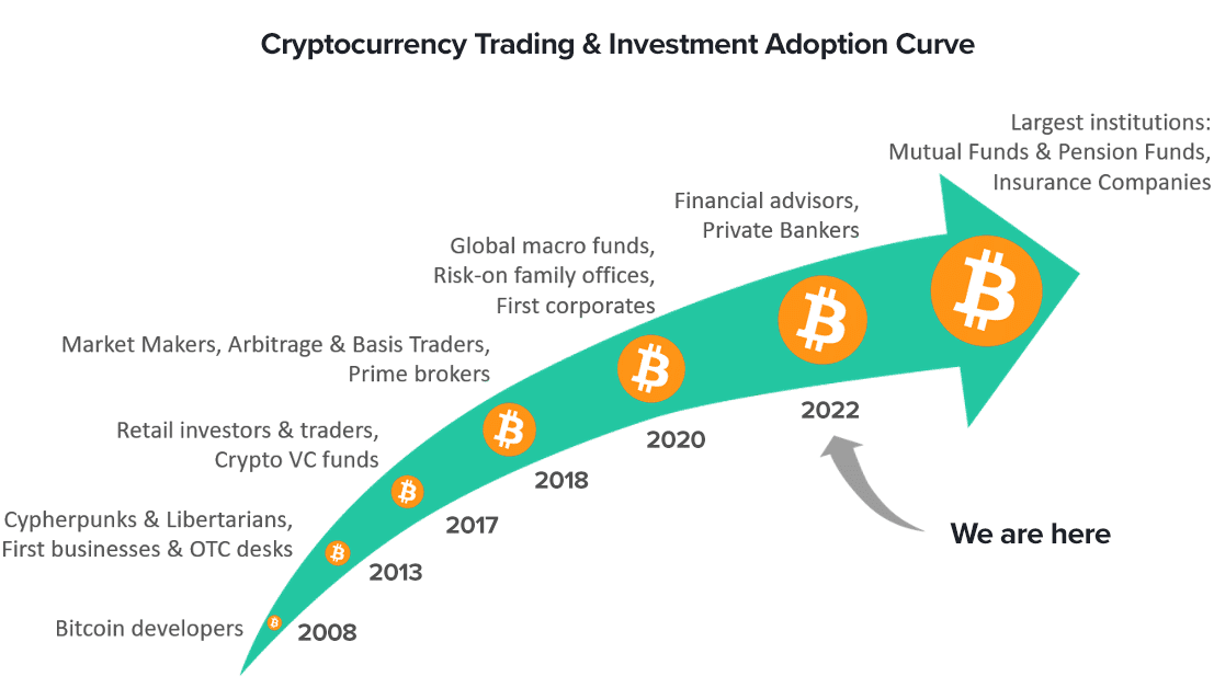 Krivka prijatia kryptomien zobrazuje rôzne segmenty používateľov, od skorých držiteľov až po oneskorencov ako sú napríklad etablované inštitúcie či penzijné fondy. Je vysoko pravdepodobné, že viac ako 10 % používateľov internetu vlastní nejakú kryptomenu alebo s ňou pracuje. Niektoré centralizované burzy dokonca odhadujú, že je na svete viac ako 300 miliónov používateľov kryptomien. V prípade krajín krivka prijatia kryptomien taktiež rastie. Právne obmedzené alebo nezákonné sú kryptomeny iba v 3 % krajín sveta. Za zmienku stojí predovšetkým Čína, kde je úplný zákaz, alebo India, ktorá má voči kryptomenám viaceré výhrady.