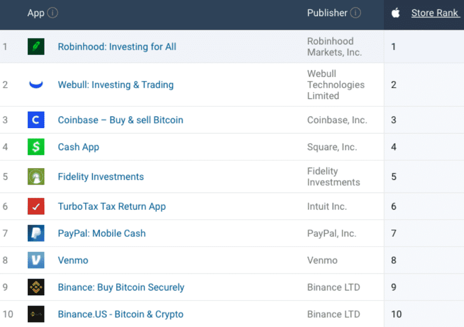 Coinbase sa v súčasnosti radí medzi najlepšie kryptomenné finančné aplikácie v Apple App Store. V prvej desiatke sú aj spoločnosti Binance a Binance U.S.