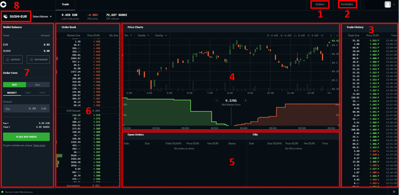 Po úspešnom prihlásení na burzu Coinbase Pro sa vám zobrazí rozhranie, ktoré si detailnejšie popíšeme pod nasledujúcim obrázkom.