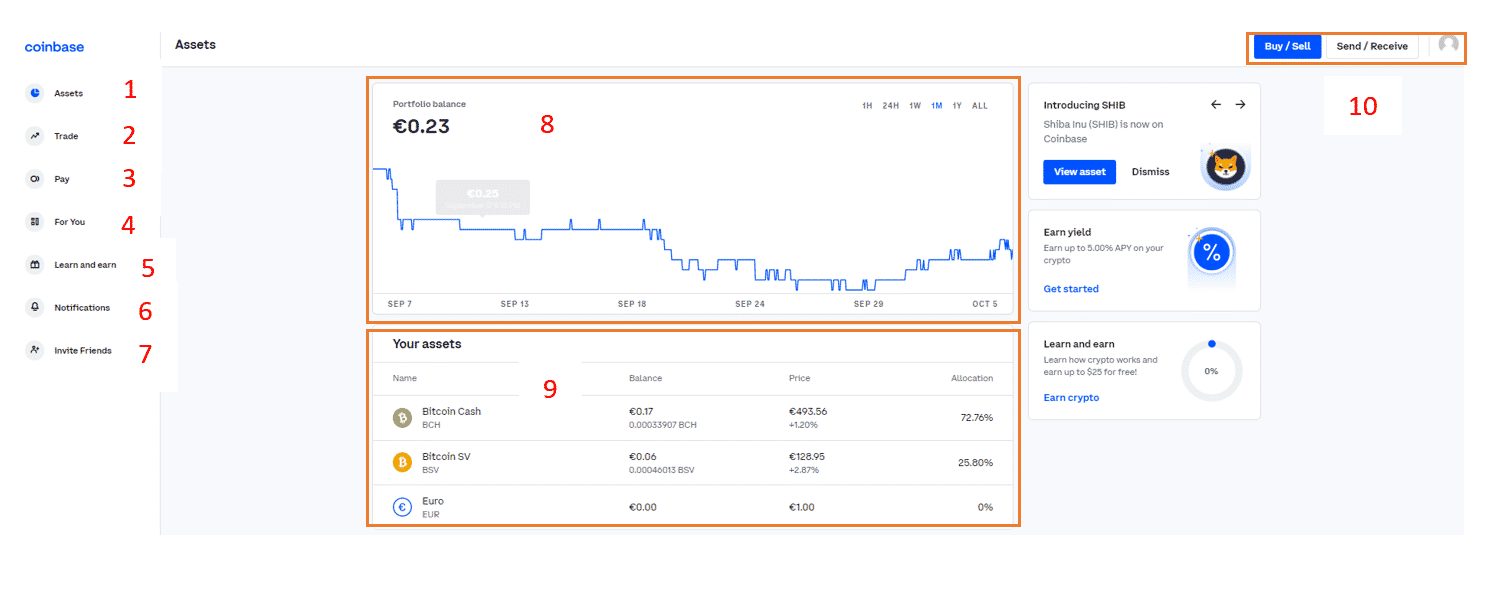 Rozhranie Coinbase je veľmi prehľadné a jednoduché. Najčastejšie využívané položky sú tie, kde sa kryptomeny obchodujú či vymieňajú. Taktiež budete používať sekciu vašich aktív a stavov účtov. Nasledujúci obrázok poskytuje vizuálne zobrazenie jednotlivých sekcií, ktoré si teraz vysvetlíme.