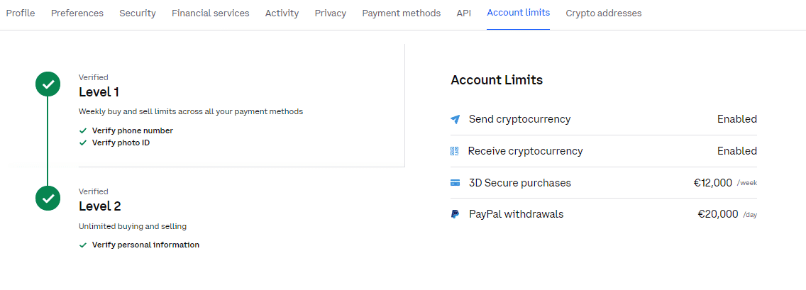 Coinbase nemá stanovené limity na počet zrealizovaných obchodov ani na výšku kapitálu, za ktorý obchody realizujete. V prípade vkladania a vyberania kryptomien taktiež neplatia vôbec žiadne limity. Burza však stanovila limity pre výber a vklad cez banku. Limity sú nasledovné:
