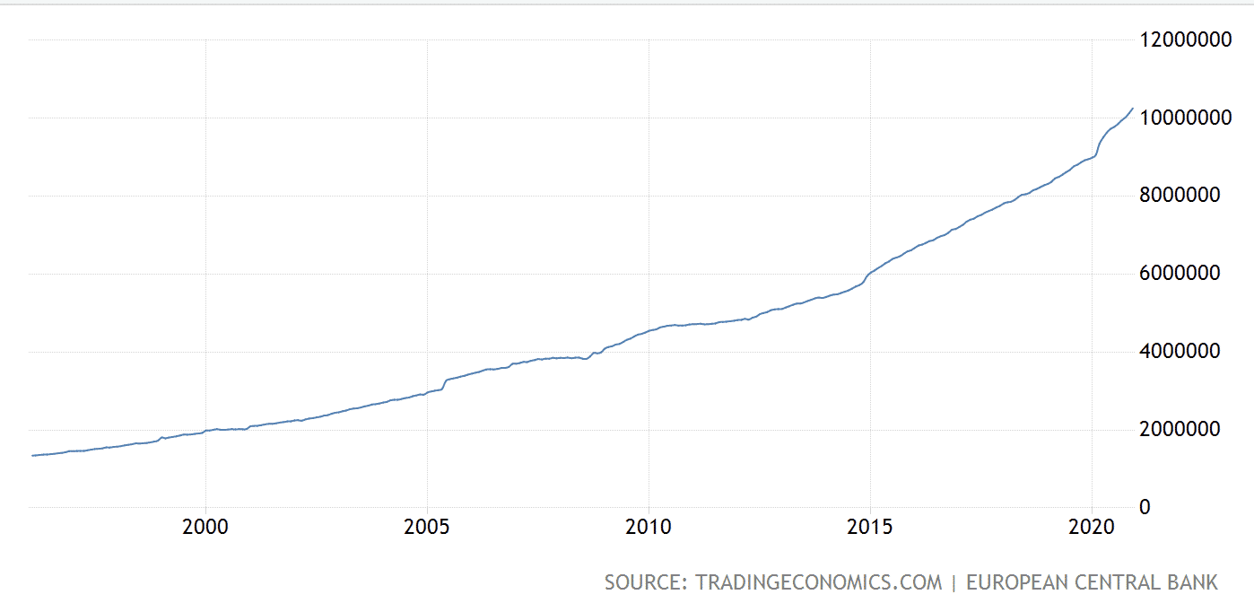 Bitcoin ani Ethereum nemajú centrálnu banku, ktorá by neustále znehodnocovala hodnotu vašich peňazí. Európska Centrálna Banka v roku 2020 vytlačila viac než 1000 miliárd eur (jeden bilión). Celkovo je teraz v obehu viac než desať biliónov eur. To znamená, že v priebehu minulého roka vaše úspory stratili 10% svojej hodnoty! Videli ste niekedy banku, ktorá by vám dala 10% úrok p.a.? Asi ťažko.