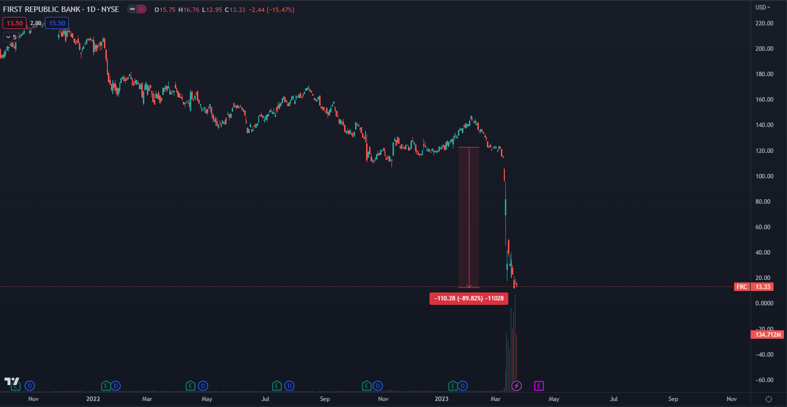 Podľa údajov z TradingView sa akcie FRC obchodujú v čase písania článku na úrovni 13,28 doláru. Ešte 1. februára sa cena pohybovala tesne nad hodnotou 140 dolárov a 1. marca na hladine 123 dolárov. Len v priebehu mesiaca marec hodnota akcií klesla o neuveriteľných 90 %