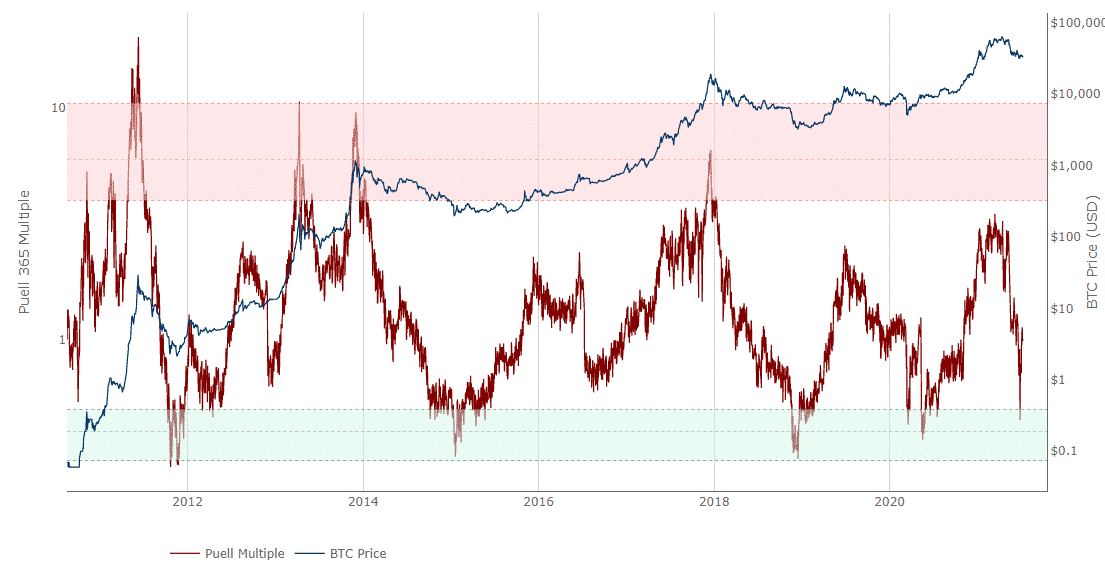 Bitcoin Puell Multiple model ukazuje priemernú výkonnosť mining siete. Tá po veľkom regulačnom zákaze v Číne výrazne upadla. Baníci a veľké firmy v tomto štáte vypli všetky zariadenia a následne cena výrazne poklesla. To spôsobilo domino efekt, ktorý donútil kvôli cenovému poklesu a úpadku ziskovosti vypnúť zariadenia aj pre dosť veľkú časť minerov prakticky z celého sveta.
