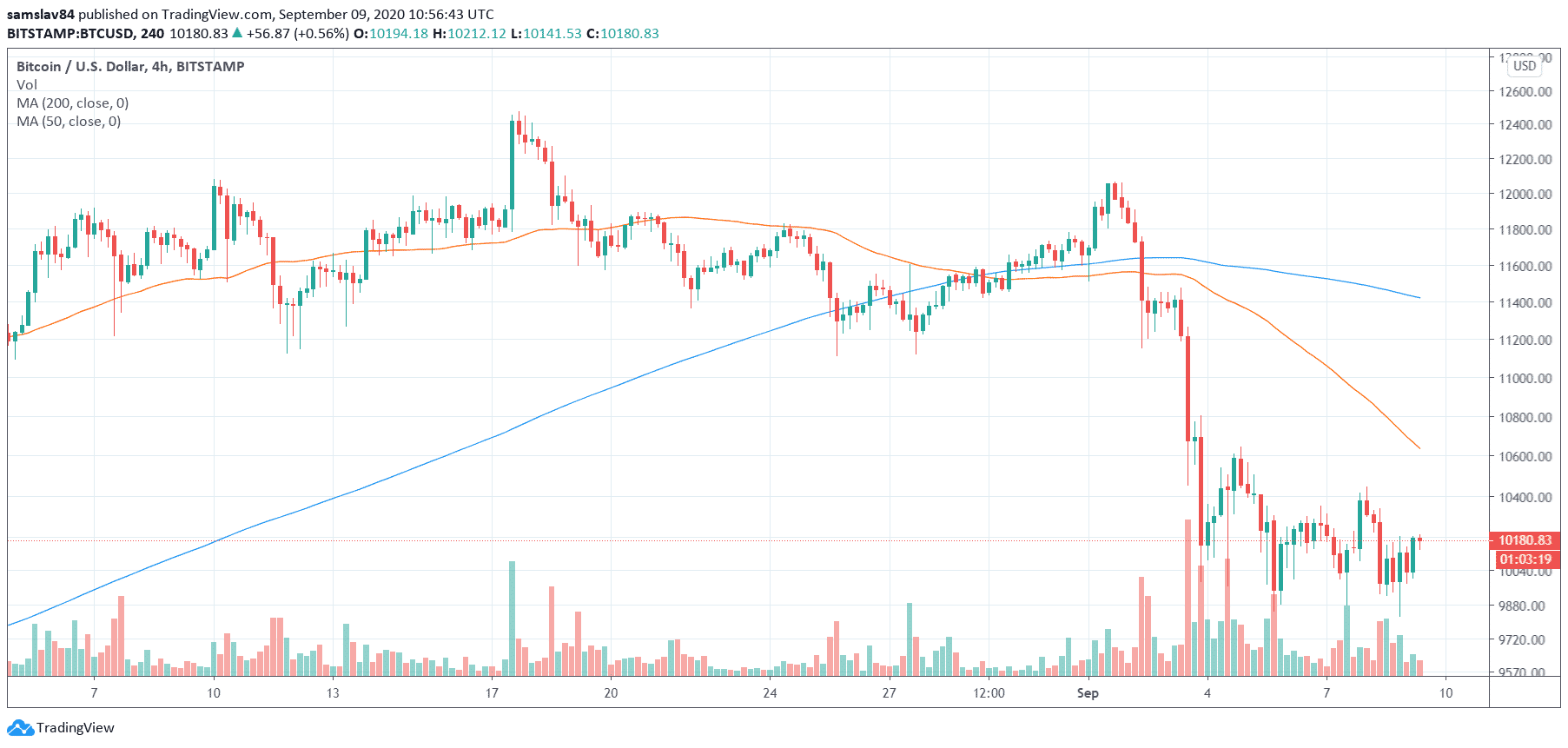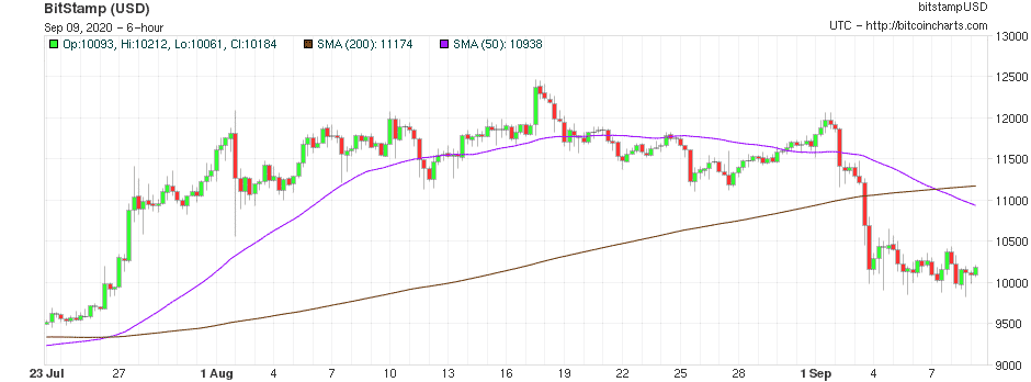Death cross sa už objavil na oboch dôležitých strednedobých timeframoch. 29. augusta, teda štyri dni pred prvým výpredajom sa objavil na 4h časovom rámci a teraz ho už vytvorili aj 6h sviečky.