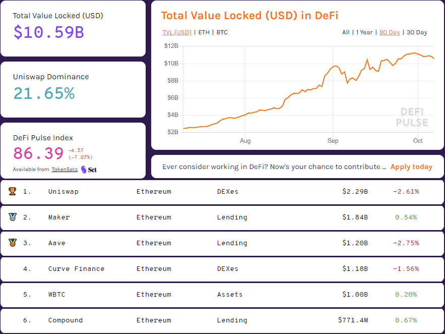 Úspech DeFi platformy v žiadnom prípade neimplikuje, rast coinu. Jasným príkladom je Uniswap token, ktorý klesá, zatiaľ čo objem kapitálu uzamknutého v Uniswap smart kontrakte presiahol 2,2 miliardy dolárov. Nenechajte sa teda oklamať číslami na defipulse.com.