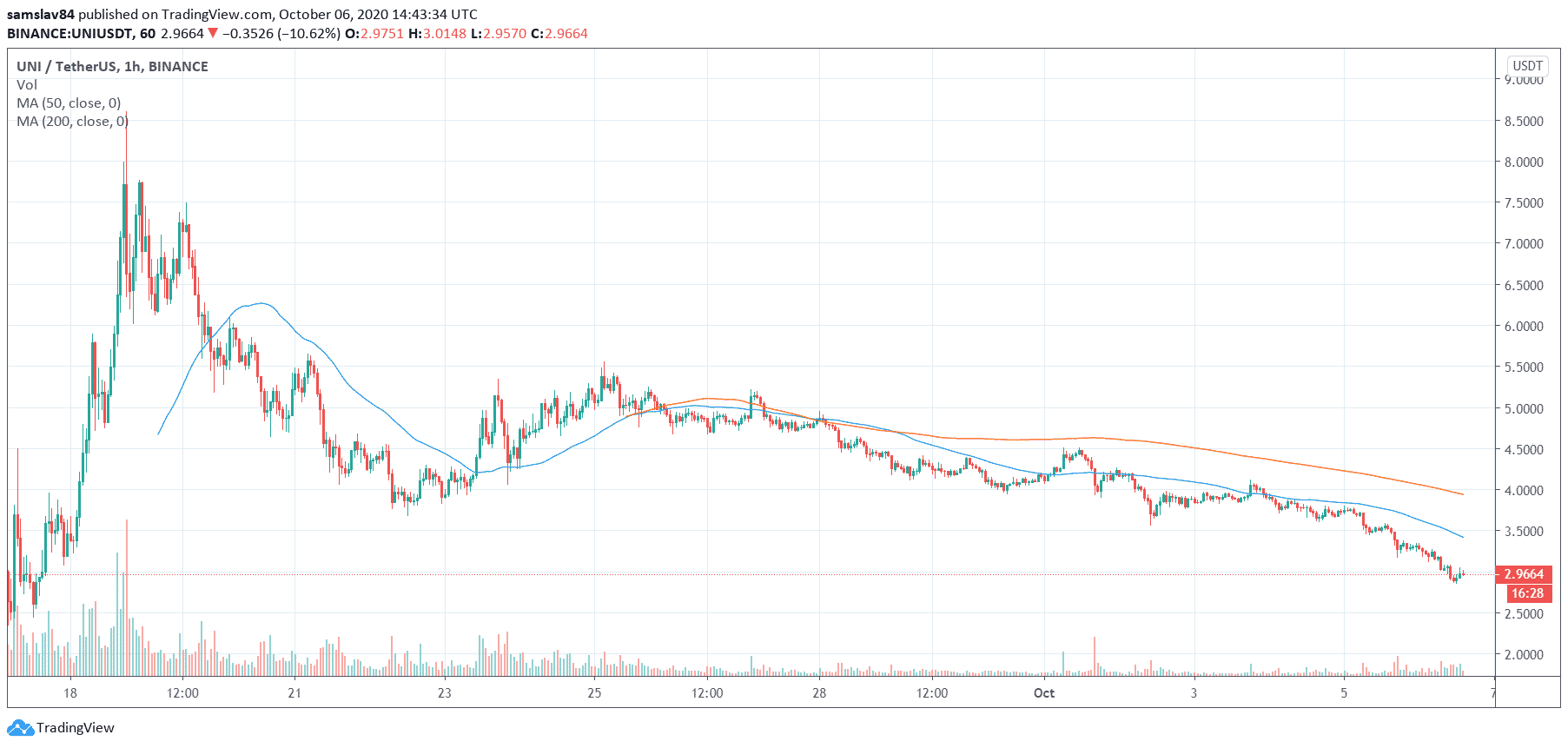Burza Uniswap ako taká s dvojmiliardovou kapitalizáciou jednoznačne prosperuje. UNI token je však na tom dosť zle. To sa však dalo čakať. Keď Uniswap v polovici septembra prišiel s najväčším airdropom histórie, bolo jasné, že skôr či neskôr dôjde ku kolapsu.