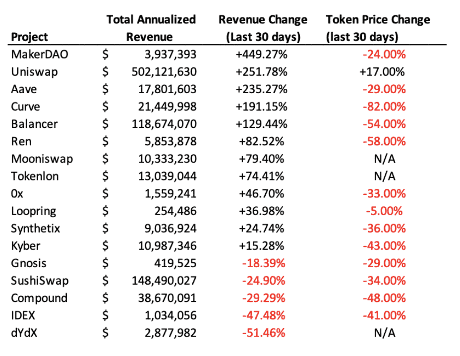 Ako ukazuje graf vyššie, za posledných 30 dní prudko vzrástli príjmy hlavných protokolov DeFi. Cena podkladových tokenov DeFi sa napriek tomu prepadla z 20% na 82%. Napríklad Maker poklesol za posledných 30 dní o 24%, ale v rovnakom období zaznamenal nárast výnosov o 449%.