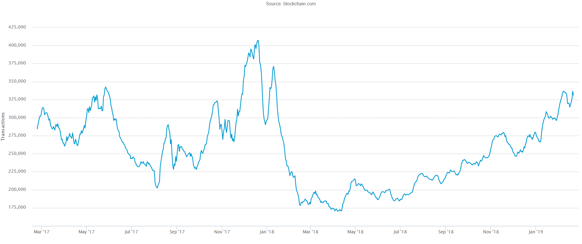 Počet transakcií Bitcoinu (TPS) zaznamenal výrazný prepad po prasknutí bubliny v januári 2018. Odvtedy však táto štatistika stabilne stúpa a nezdá sa, že by ju v dohľadnej dobe malo niečo zbrzdiť.