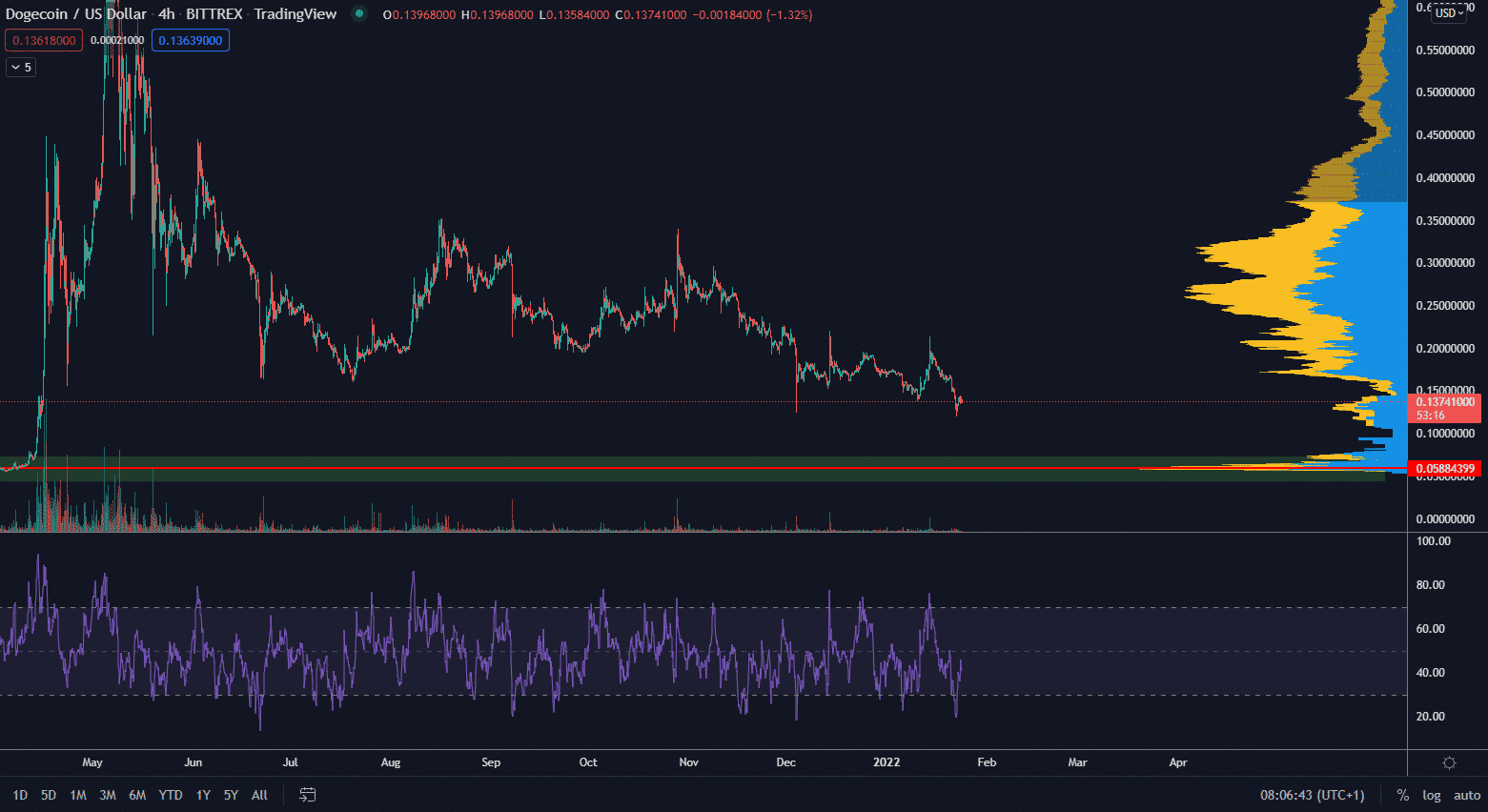 Dogecoin, tak ako celý trh, pokračuje v korekcii a nedarí sa mu dosiahnuť rastúce minimum ani rastúce maximum z dlhodobého hľadiska. V čase písania článku sa obchoduje na hladine 0,136 $, čo predstavuje pokles o zhruba 80 % od ATH. Preto môžeme identifikovať súčasný pokles ako hlboký a zatiaľ nekončiaci.