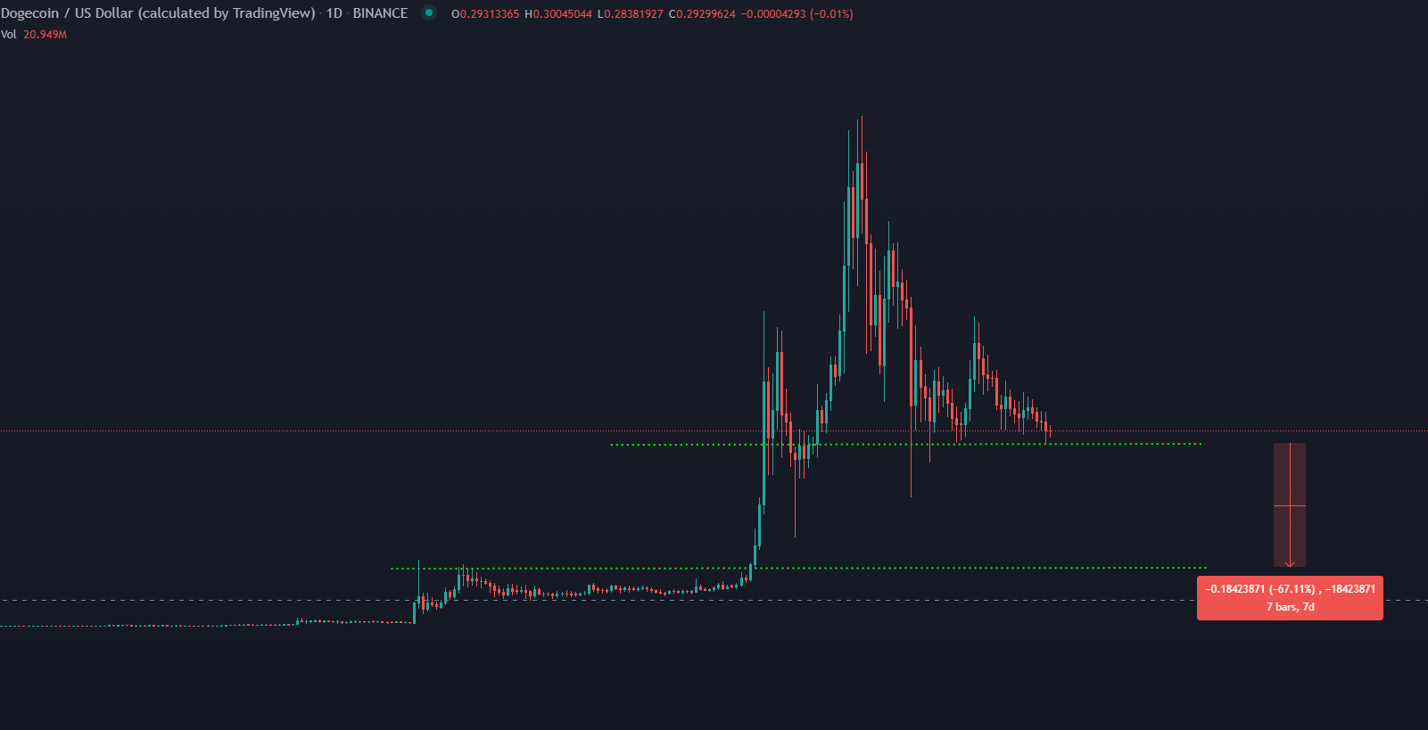 Analytik Tyler Durden upozorňuje na známy obrazec „Hlava a rameno”, ktorý sa objavuje na grafe Dogecoinu. Tento jav vzniká vtedy, keď sa na grafe vytvoria tri vrcholy na rovnakej úrovni supportu. Stredný vrchol je však vyššie ako zvyšné dva. Podľa Durdena čaká Dogecoin ďalší pokles o minimálne 67%. V prípade, že bude prelomený support 0,299 USD, DOGE sa vydá cestou medveďov.