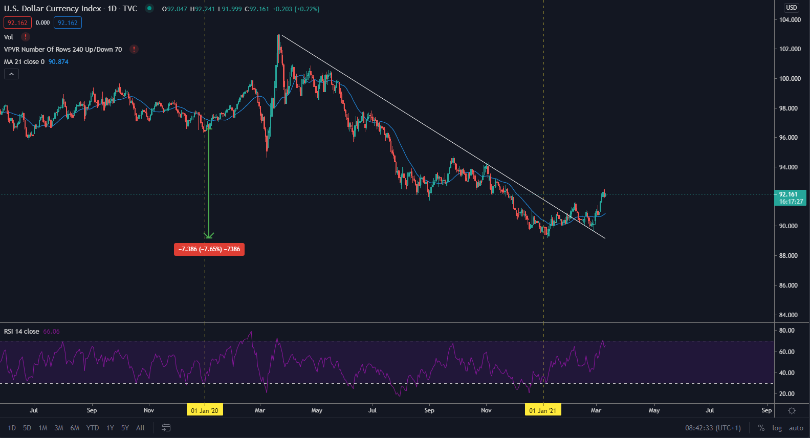 Minulý rok patril k najhorším v histórii dolára a zaznamenal historický pokles. Keď sa schválo viac stimulačných balíkov, celková zásoba nekrytých peňazí sa neustále zvyšovala v nevýdaných rozmeroch. S poklesom hodnoty dolára sa investori snažili vložiť kapitál na akciový trh a kryptomeny ako Bitcoin.
