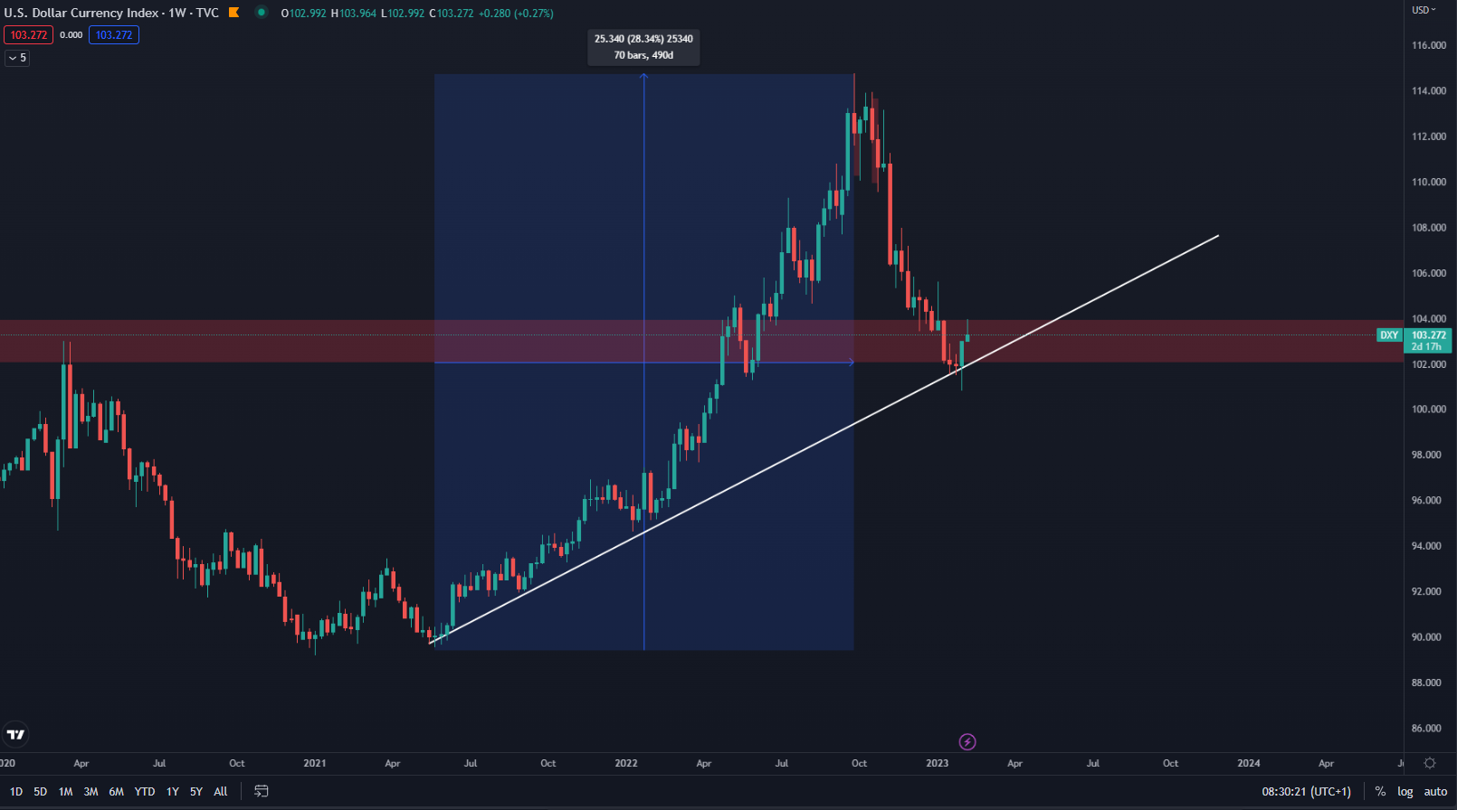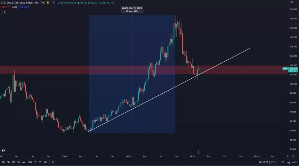 V roku 2021 a 2022 dolárový index DXY zaznamenal jeden z najväčších rastov v histórii. Za približne 490 dní dokázal stúpnuť z hodnoty 90 bodov na maximum 114 -bodov počas 26. septembra 2022. Odvtedy sa ale situácia radikálne zmenila a index spadol supportné pásmo okolo hodnoty 100 bodov. Čo to môže znamenať pre kryptomeny?