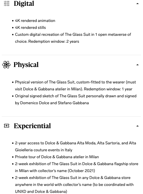 Samotní víťazi aukcie získali okrem digitálneho NFT aj jeho fyzickú verziu. Napríklad, tzv. sklenený oblek obsahoval súbor digitálneho, fyzického a taktiež zážitkového tovaru.