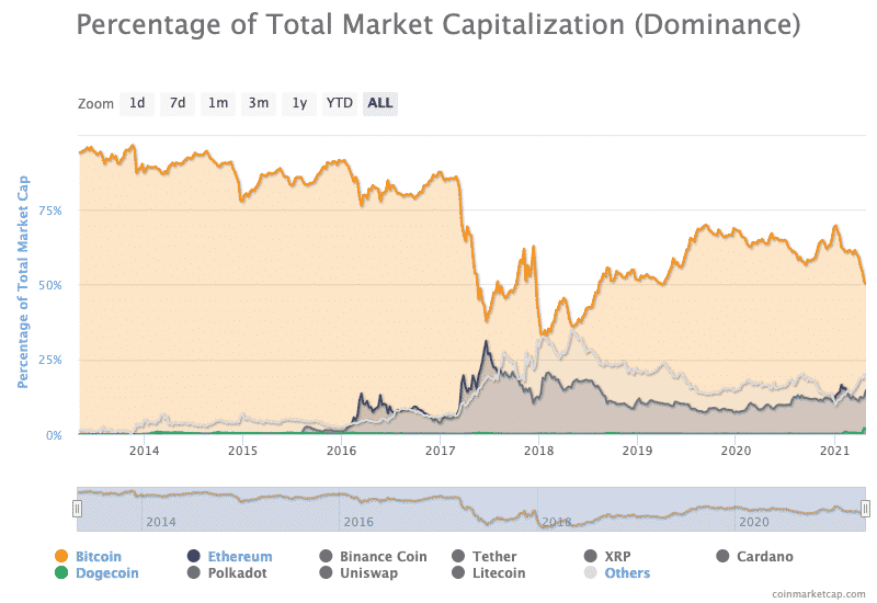 Index dominancie bitcoinu, ktorý identifikuje trhovú kapitalizáciu BTC v porovnaní so zvyškom trhu dosiahol podľa CoinMarketCap 22.apríla minimum 49,35%. Začiatok roka 2021 predstavoval index dominancie BTC hodnotu 70,68%.
