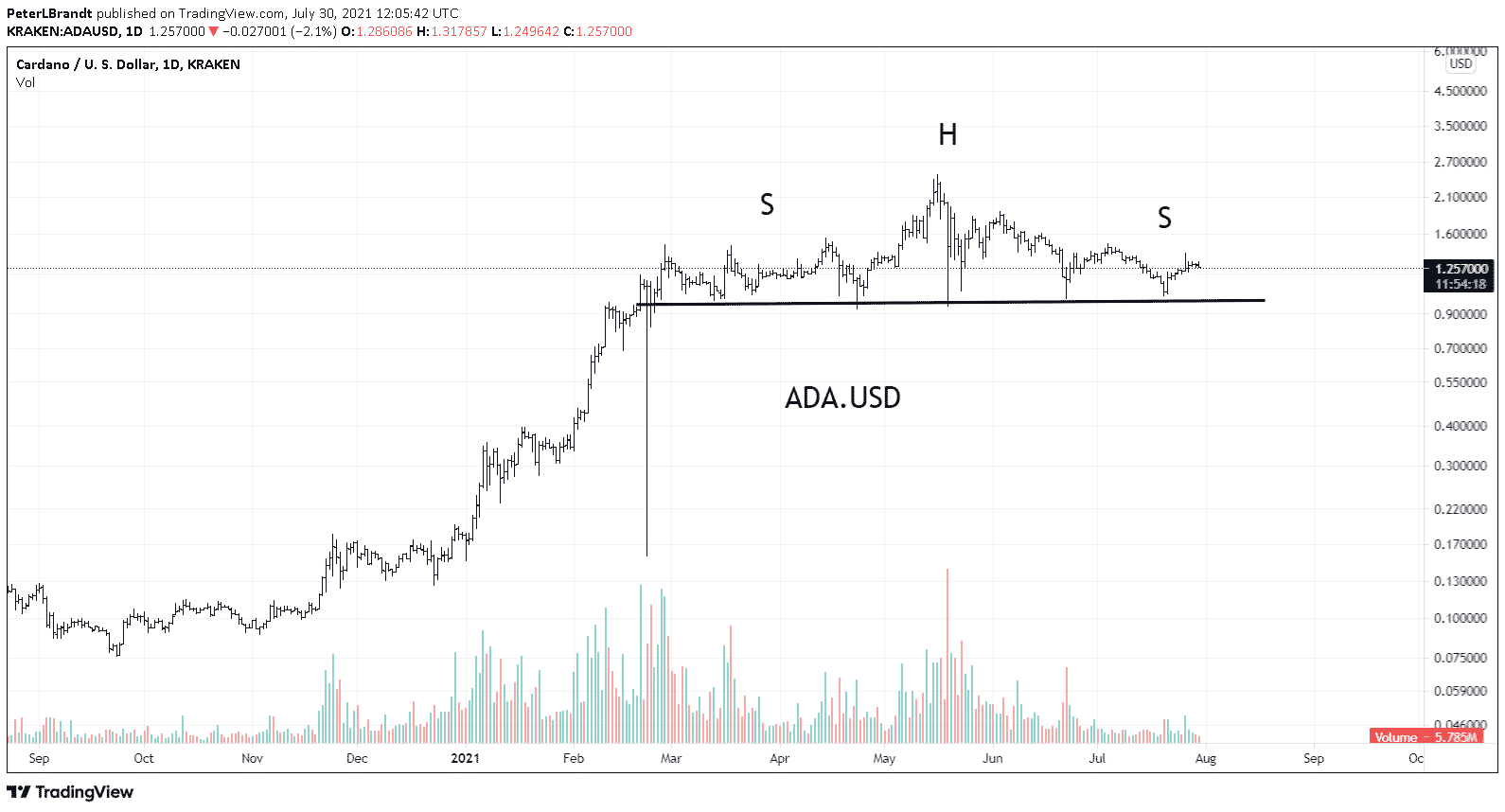 Analytik Peter Brandt sa odvoláva na klasický technický vzorec, ktorý je známy pod označením ”hlava a ramená”. Na grafe ADA sa teda vytvorily tri po sebe idúce vrcholy na jednej úrovni supportu. Cena by sa mala s veľkou pravdepodobnosťou prepadnúť pod úroveň supportu, ktorá je nazývaná ”neckline”. Pokles bude následne taký veľký, ako je maximálna výška medzi stredným vrcholom a supportom.