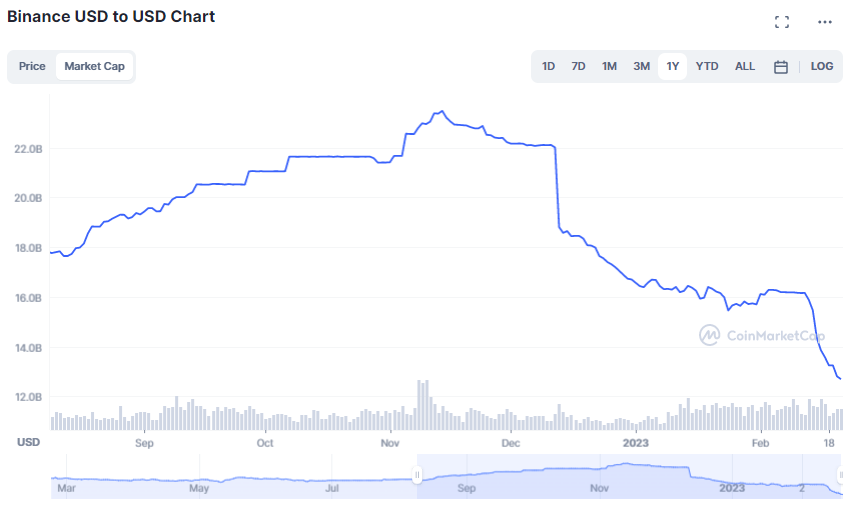 Trhová kapitalizácia ešte 12. februára dosahovala úroveň 16,15 miliardy dolárov, zatiaľ čo v čase písania článku 21. februára sa nachádza na úrovni 12,69 miliardy dolárov. To znamená, že v priebehu 9 dní z trhu zmizlo takmer 3,5 miliardy BUSD.