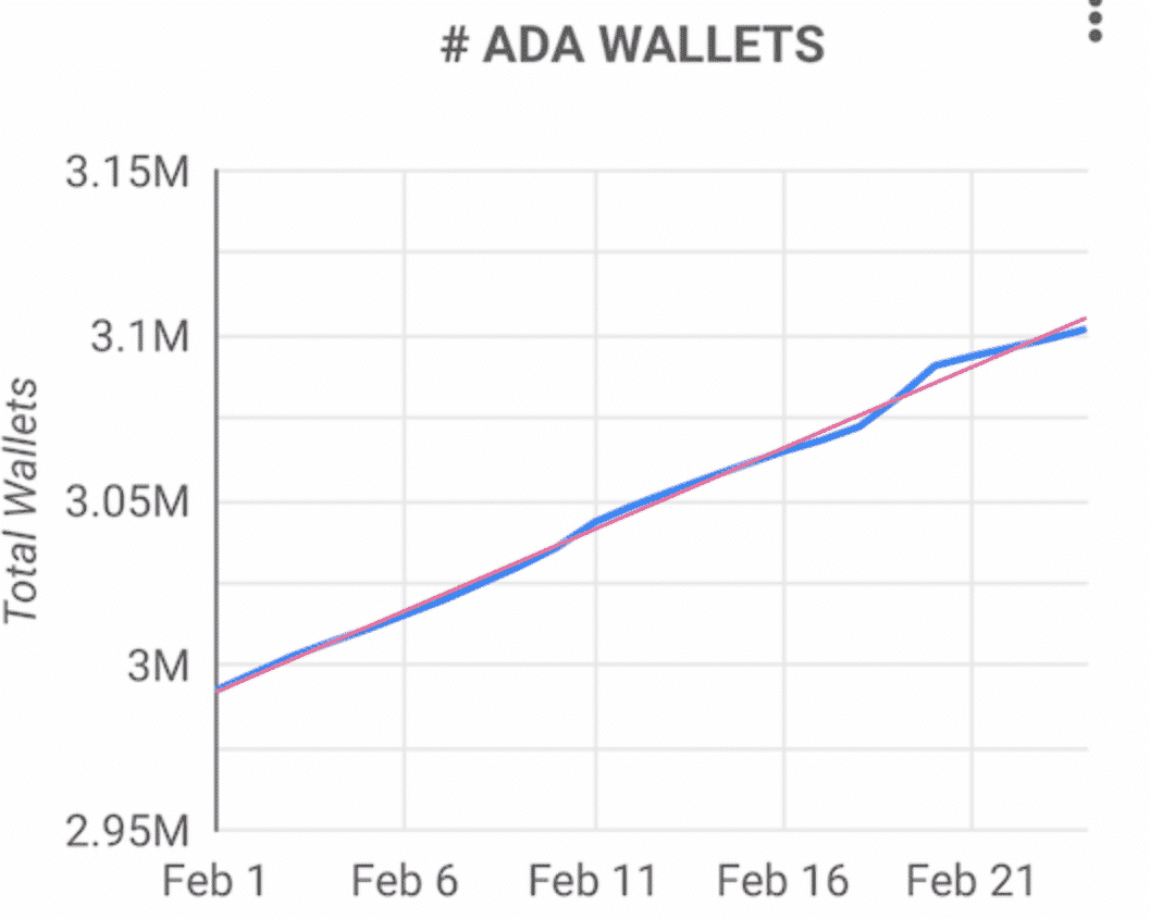 Zaujímavosťou je, že od februára 2022 denne pribudlo do siete celkovo 4 565 nových peňaženiek. 4. februára prekonala peňaženka Cardano tri milióny peňaženiek svojej natívnej kryptomeny ADA. Tieto peňaženky sú teraz aktívne na platforme, pričom začiatkom roka 2021 ich bolo len niečo vyše 200 000.