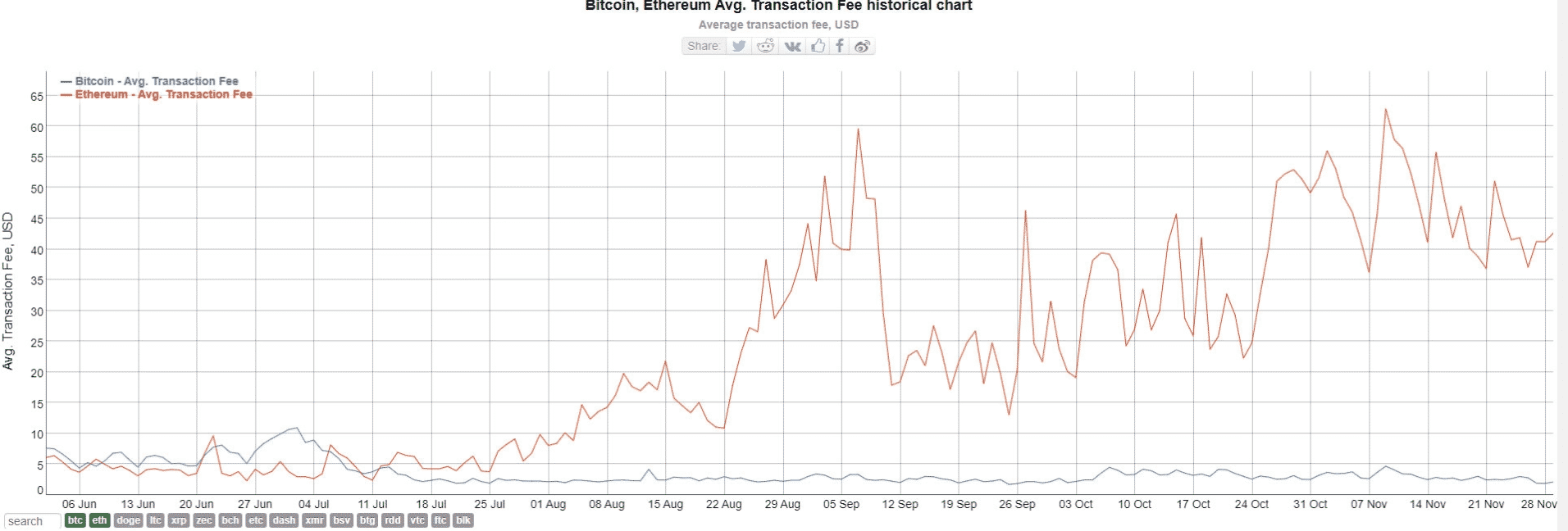 Podľa Bitinfocharts je priemerný transakčný poplatok v sieti Bitcoin v súčasnosti okolo 2,13 USD. V porovnaní s tým je priemerný poplatok siete Ethereum neuveriteľných 42,58 USD. Poplatky za bitcoinové transakcie sa tento rok znížili o viac ako 50 %.
