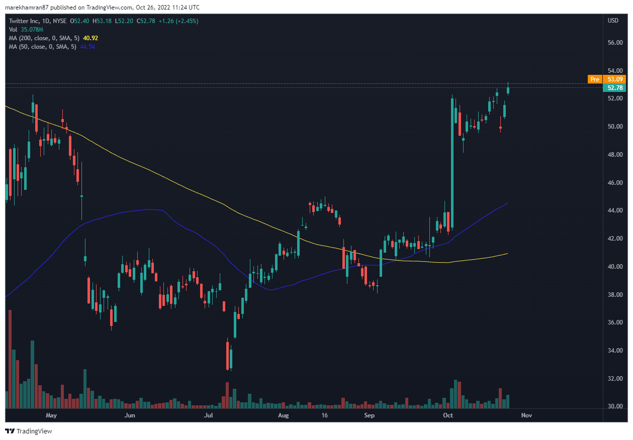 Akcie Twitteru reagovali okamžitým rastom a očakáva sa, že bude rast pokračovať aj po finalizácii nákupu.
