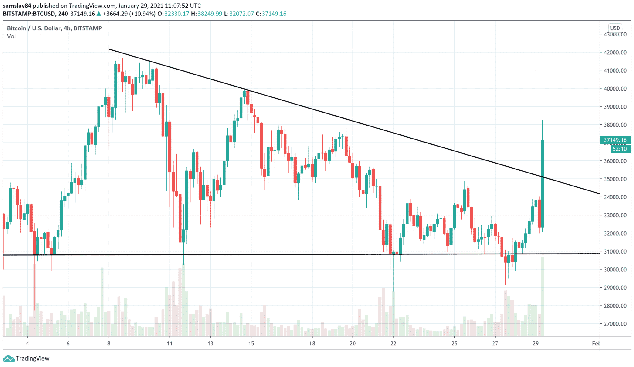 Obchodníci, ktorí mali otvorené short pozície a očakávali ďalší pokles, začali všetko zatvárať. Cena rástla a na burze Binance došlo k likvidácii shortov v hodnote 57 miliónov dolárov. Pri zatváraní shortu sa nakupujú Bitcoiny, čo tlačilo cenu ešte vyššie a vznikla kaskádová rekacia, ktorá cenu vystrelila nad klesajúcu trendline.