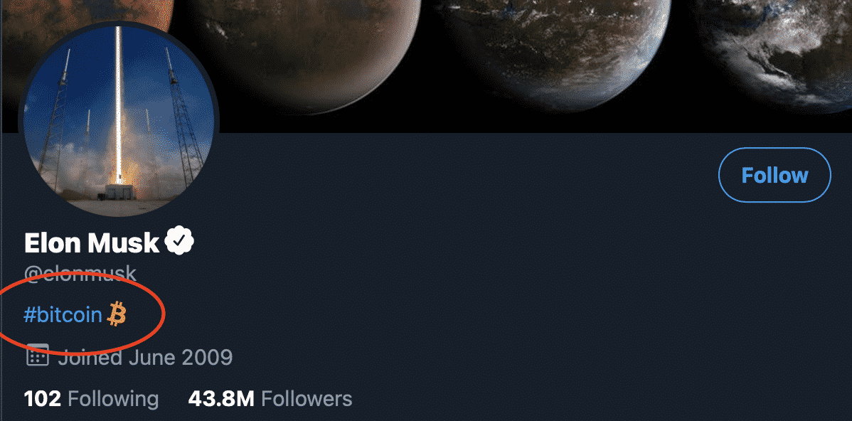 Jediný deň si dám pauzu kvôli naxhladeniu a na trhu s kryptomenami sa hneď začnú diať veci… Dogecoin spravil 900% pumpu a Elon Musk spôsobil rast BTC o 6000 $. Pred dvoma hodinami si totiž do popisu svojho profilu na Twitteri dal slovo „Bitcoin“. Samozrejme s hashtagom a logom. Reakcia trhu na seba nenechala dlho čakať.