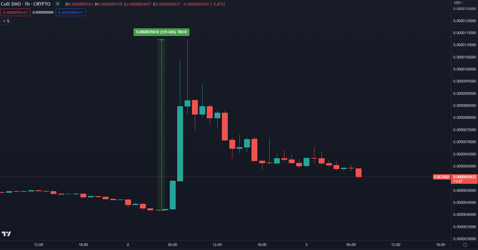 Token cult DAO dokázal podľa údajov z TradingView zaznamenať len za 3 hodiny zhodnotenie až 170 %. Graf nižšie zobrazuje hodinové sviečky, pričom v čase písania článku sa token prepadol na cenu 0,0000055637 dolára. Ako môžete vidieť, naskakovať do takýchto neprirodzených a umelo vyvolaných krátkodobých trendov sa neoplatí, keďže reakcia trhu je extrémna.