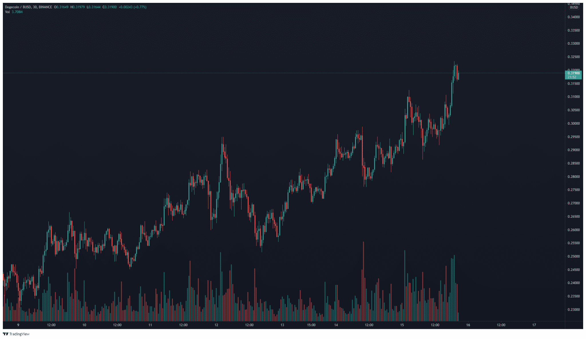 Dogecoin zaznamenal počas nedele výrazný rast a prekonal hranicu 0,30 USD po tom, čo Elon Musk súhlasil s Markom Cubanom, že je DOGE najsilnejším výmenným médiom medzi kryptomenami.