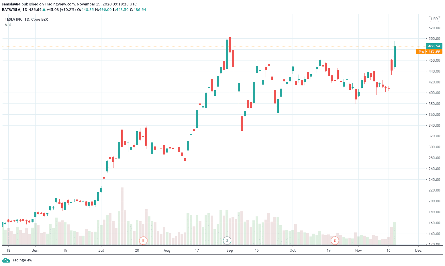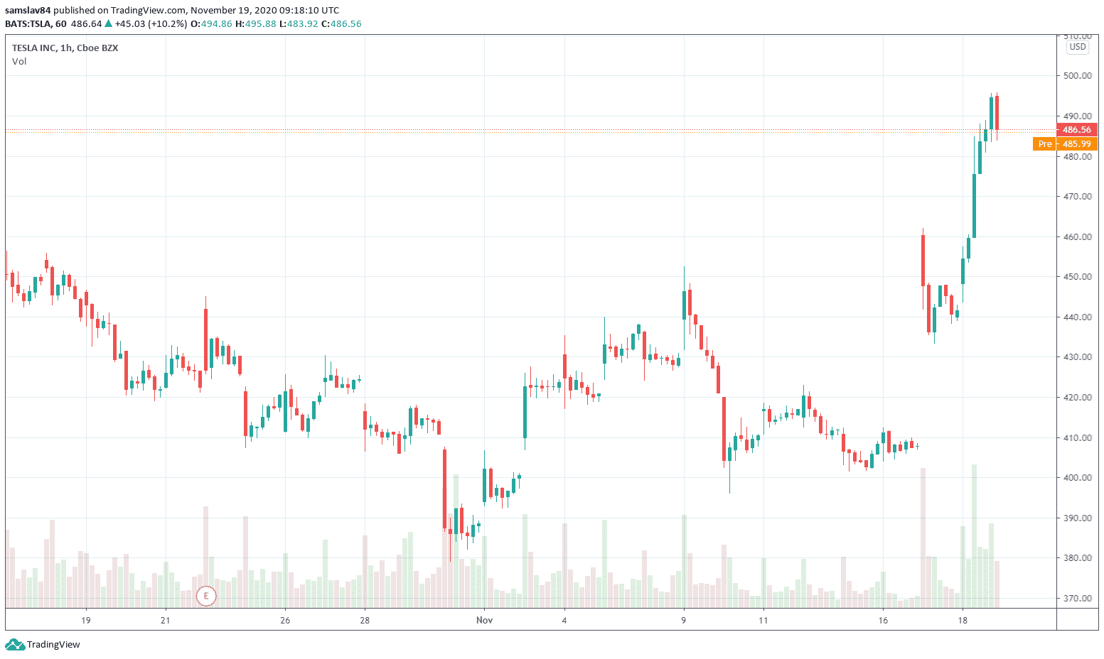 Zatiaľ čo minulý piatok uzavreli na cene 408$, v pondelok otvorili o 50$ vyššie a aktuálne sa na burze obchodujú za 486 $. To je 20% zisk za tri dni! Tesla útočí na historické maximum a je dosť možné, že ho do konca týždňa prekoná.