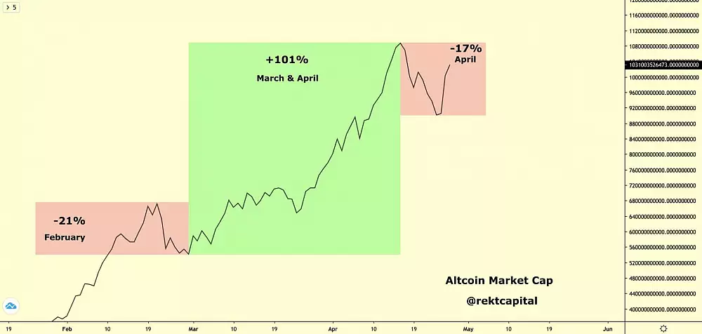 Populárny twitterový účet Rekt Capital nám priniesol zaujímavé porovnanie Altcoin Market Cap, kde môžeme vidieť, že cenový pohyb zaznamenaný v apríli má omnoho prudkejší charakter ako cenový vývoj z februára. Tento jav môže poukazovať na zvýšený záujem o altcoiny.