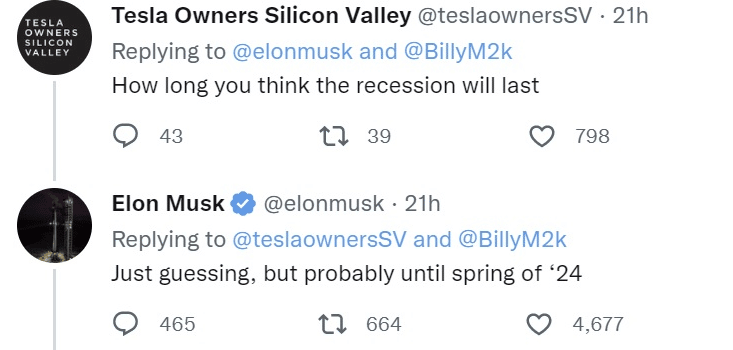 Musk reagoval na diskusiu na Tweeteri, ktorú spustil spolutvorca Dogecoinu Billy Markus. Ten napísal, že jediná globálna obava spočíva v hroziacej globálnej recesii a jadrovej apokalypse. Hneď po tom sa začalo diskutovať o tom, ako dlho by recesia mohla pretrvávať na globálnych trhoch, pričom Musk predpovedal až do jari 2024.