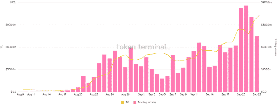 TVL a volume na Trader Joe. Zdroj: Token Terminal