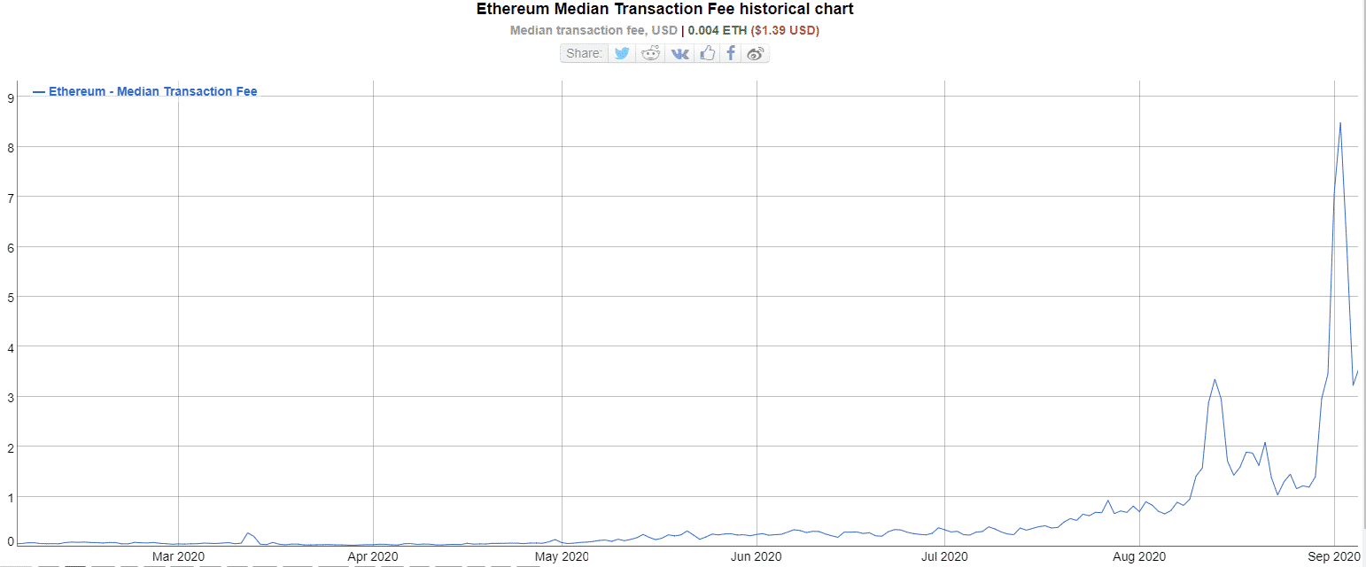 Ethereum má za sebou skvelý rok 2020, no v posledných mesiacoch narazilo na problémy s prehltením siete. ETH blockchain nestíha spracovávať množstvo transakcií a smart kontraktov, ktoré generuje DeFi ekosystém a vo výsledku tak transakčné poplatky vyleteli vysoko nad bývalé ATH z roku 2017. Ich medián na začiatku septembra dosiahol 8,5 $! Včera to bolo takmer 3,6 $.