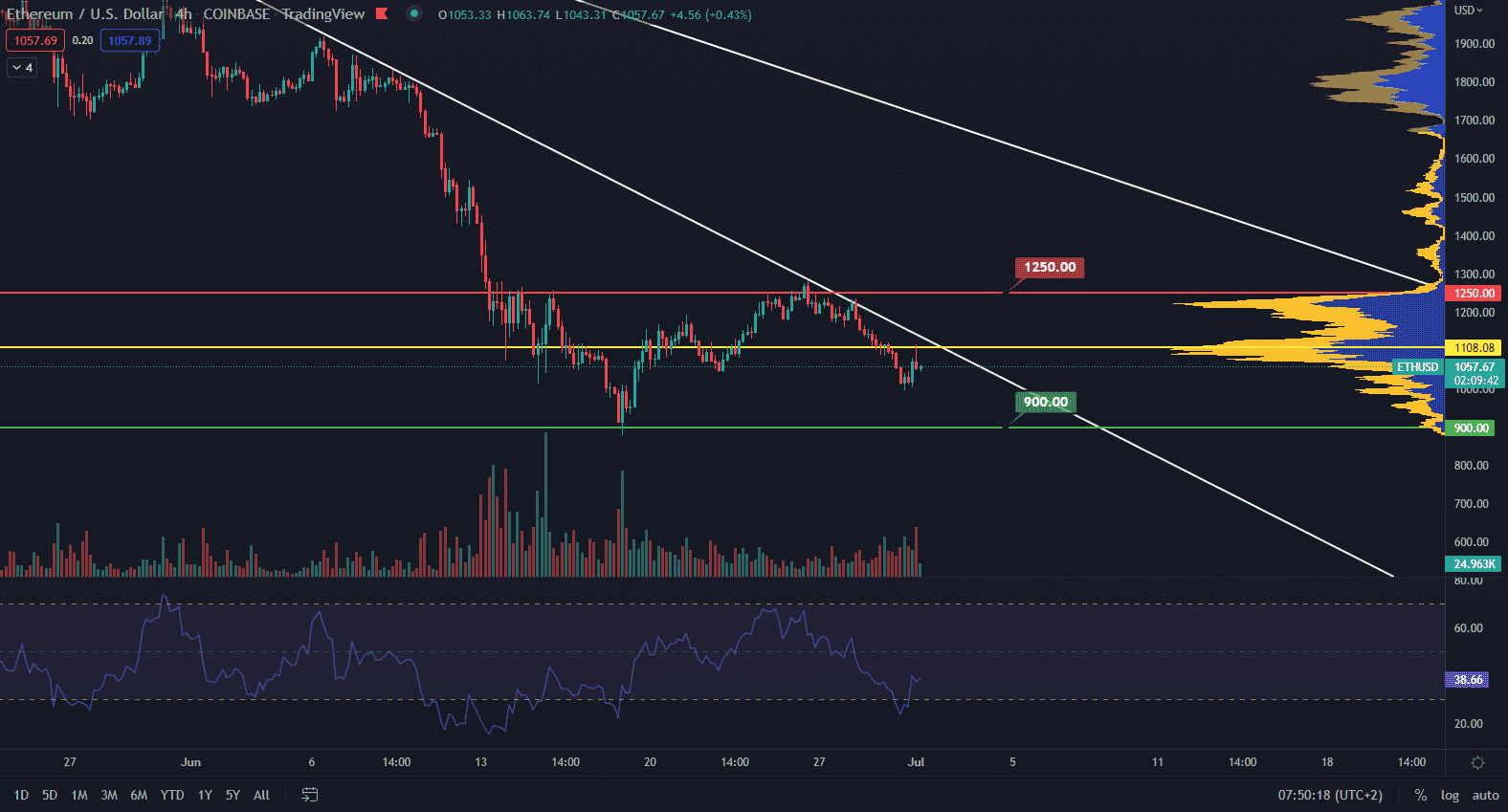 Graf nižšie poukazuje na snahu ceny vytvoriť vyššie lokálne minimum. Ak sa to cene podarí, Ethereum bude pokračovať sideway v rozmedzí supportu 900 $ a rezistencie 1 250 $. Pokým cena neprekoná jednu z týchto hladín, tak sideway štruktúra bude stále aktuálna. Kam sa však môže cena pohnúť najbližšie obdobie?